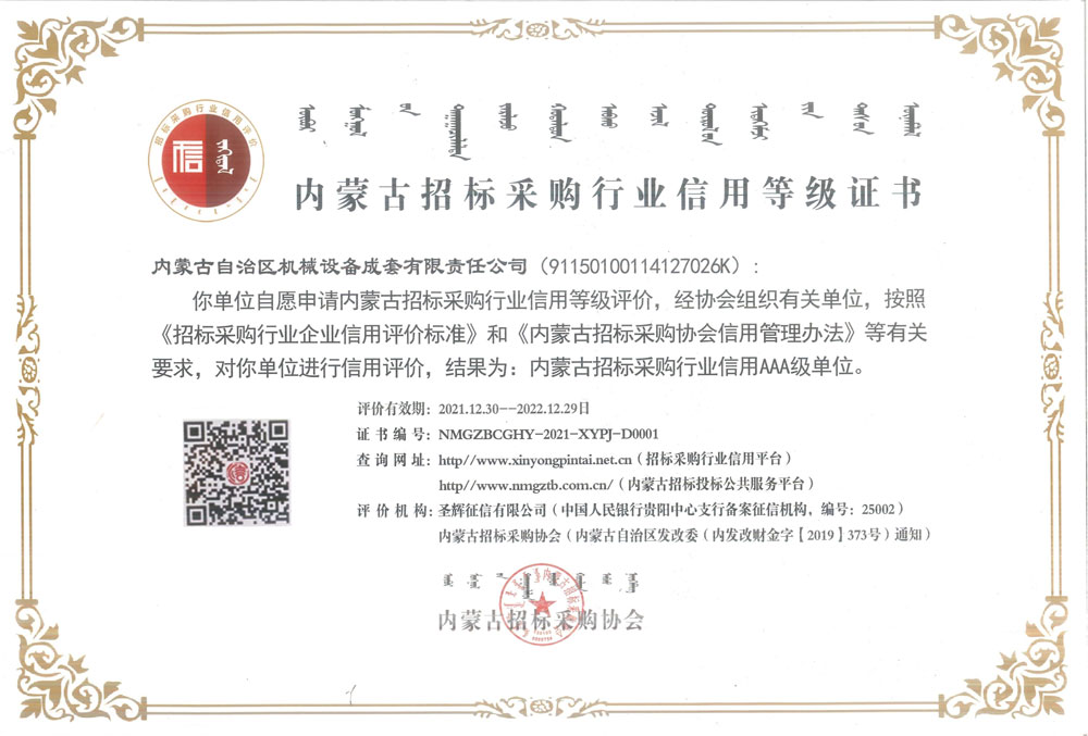 內蒙古招標采購行業(yè)信用AAA級單位資格證書